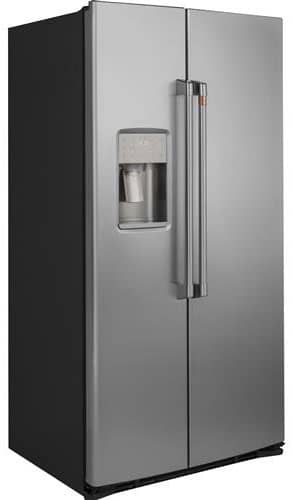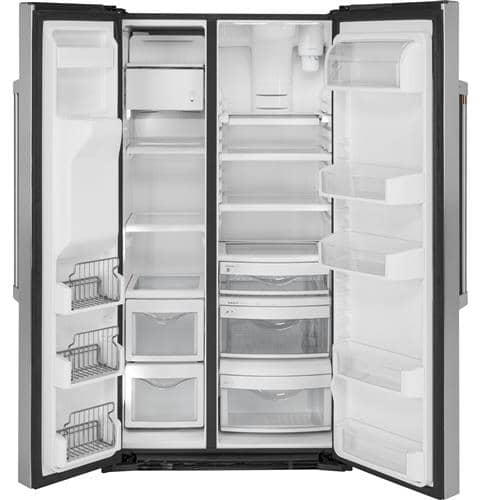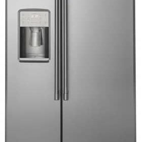 Cafe CZS22MP2NS1 21.9 Cu. Ft. Stainless Steel Counter-Depth Side-By-Side RefrigeratorThanks to this side-by-side refrigerator, your kitchen will always look and feel impeccably organized. Its counter-depth design ensures a flush fit with your surrounding cabinetry, leaving the space’s many edges perfectly aligned. On the inside, you can easily adjust slide-out, spillproof glass shelves and Clear Look door bins for the flexibility you need when you’re handling groceries or cleaning up. Features