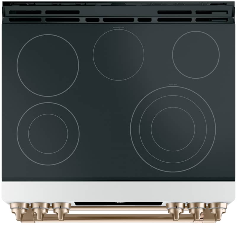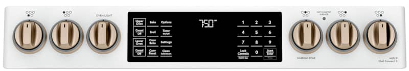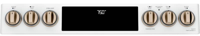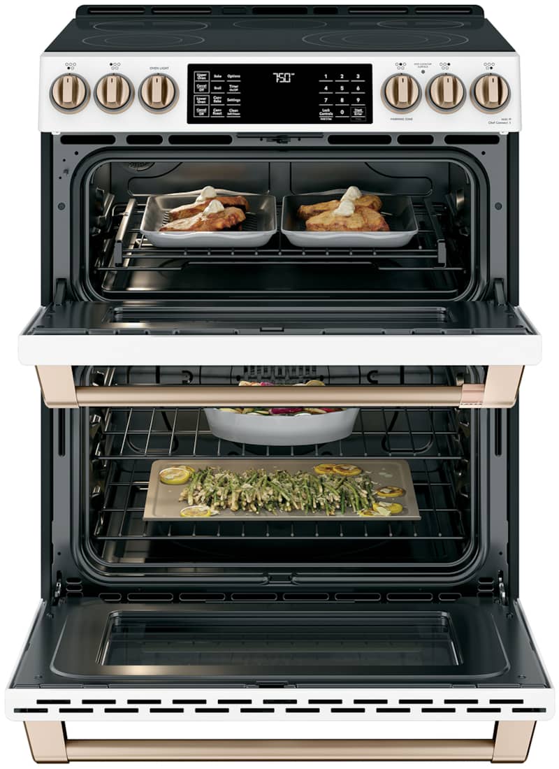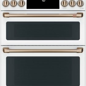 Cafe ADA 30″ Matte White With Brushed Bronze Smart Front-Control Radiant And Convection Double-Oven Slide-In Electric Range