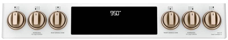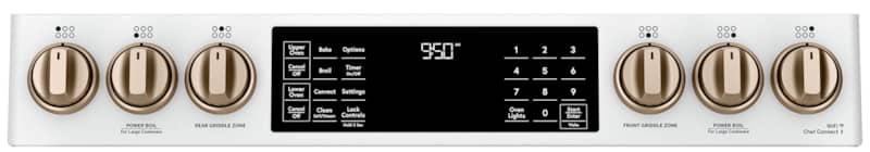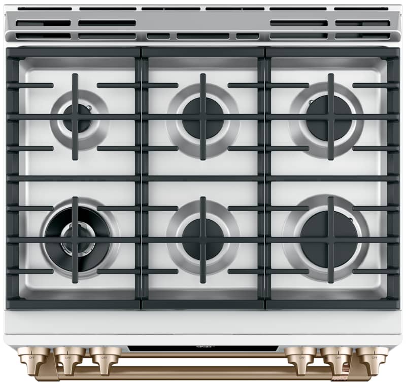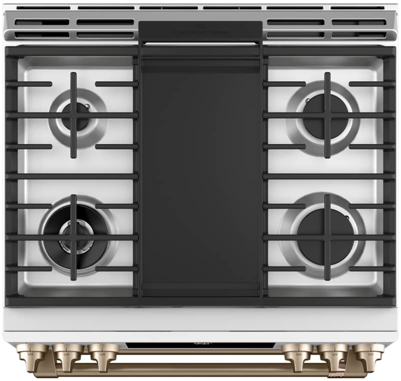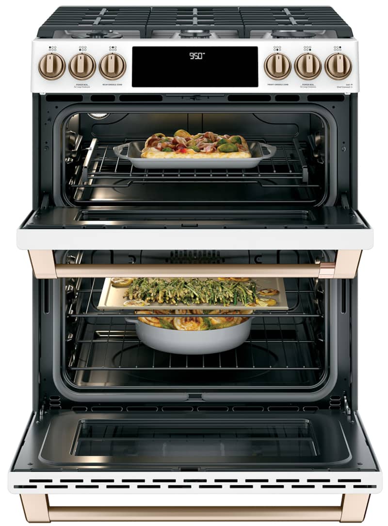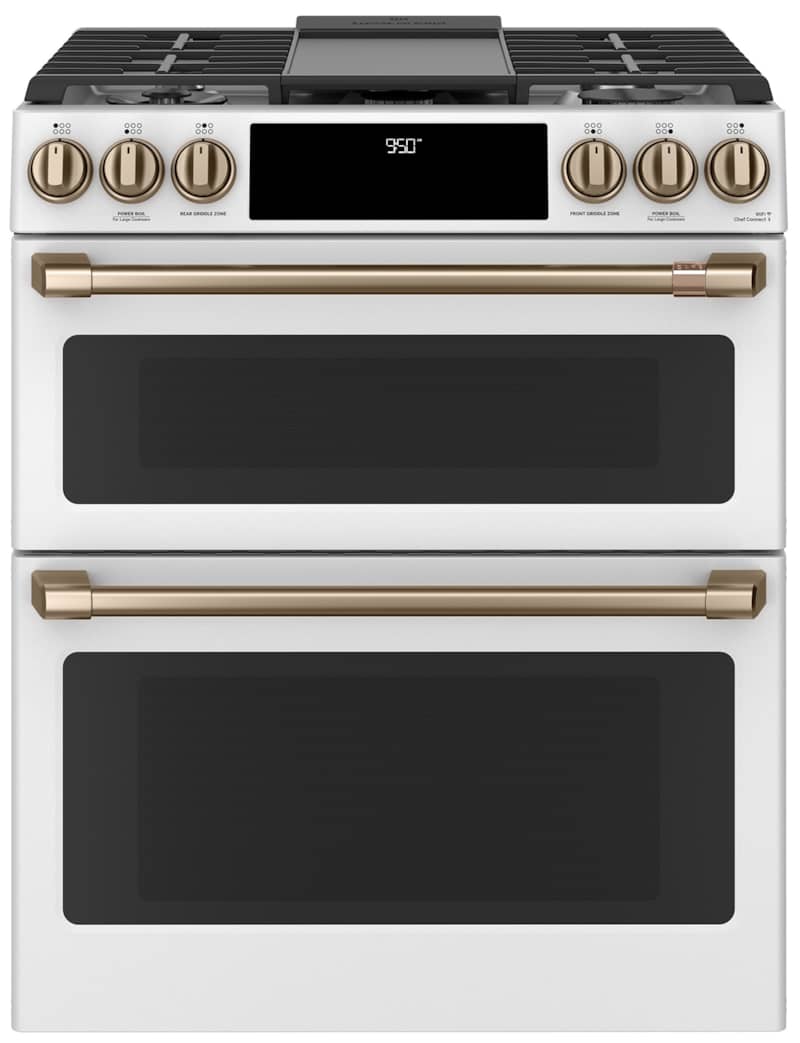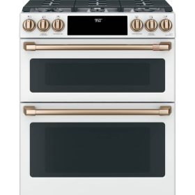 Cafe ADA 30″ Matte White With Brushed Bronze Smart Slide-In Front Control Dual-Fuel Double-Oven Range With Convection